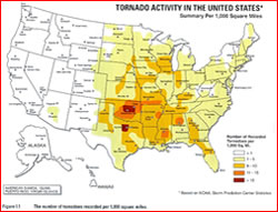 Compared with other States, Texas ranks number 1 for frequency of Tornadoes, 1 for number of deaths, 1 for injuries and 1 for cost of damages. Based on data from 1950 - 1995.